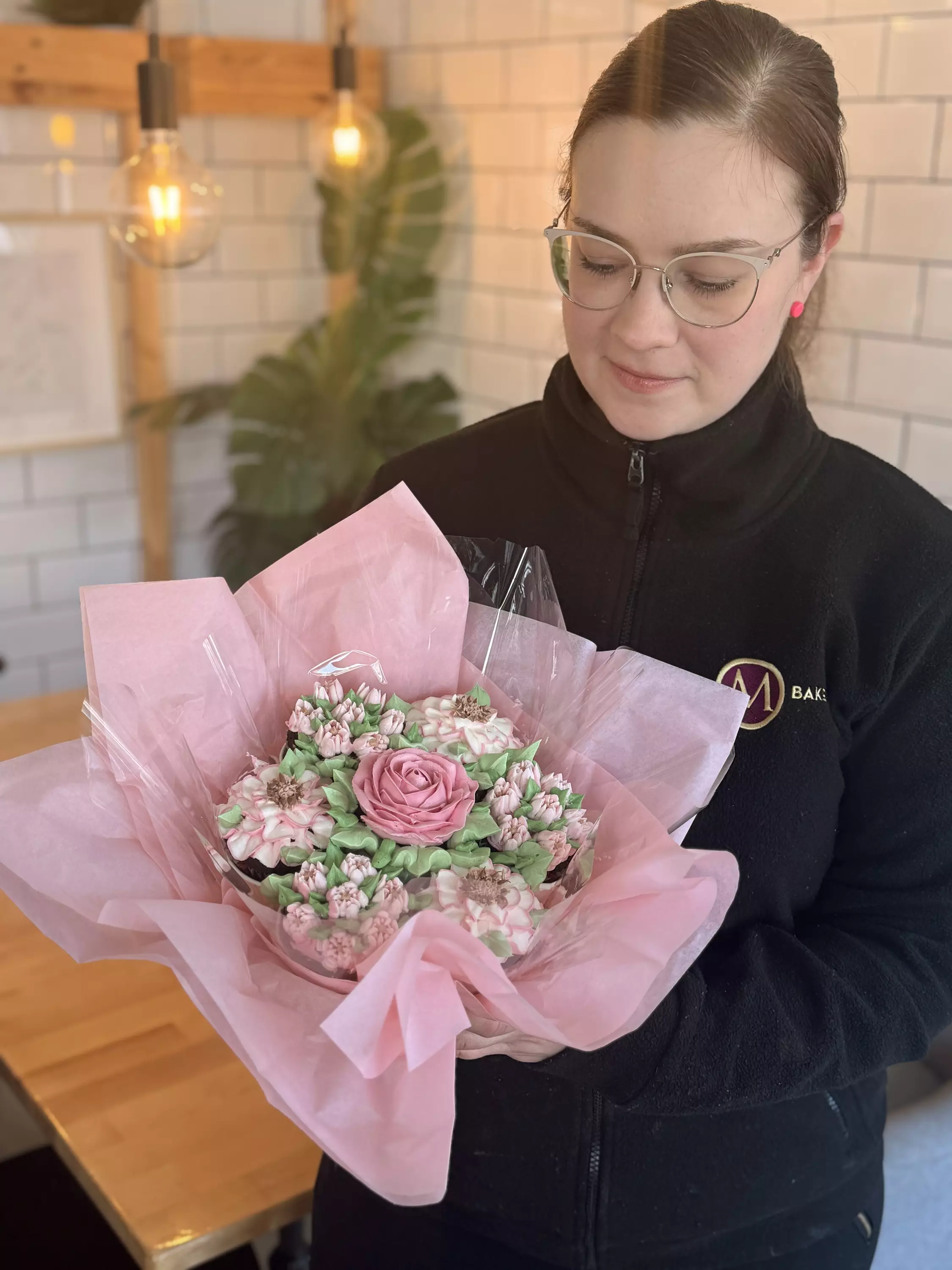 Tämä upea syötävä kukkakimppu sisältää 7 yksilöllisesti koristeltua kuppikakkua, jotka on sommiteltu näyttämään aidolta kukka-asetelmalta.