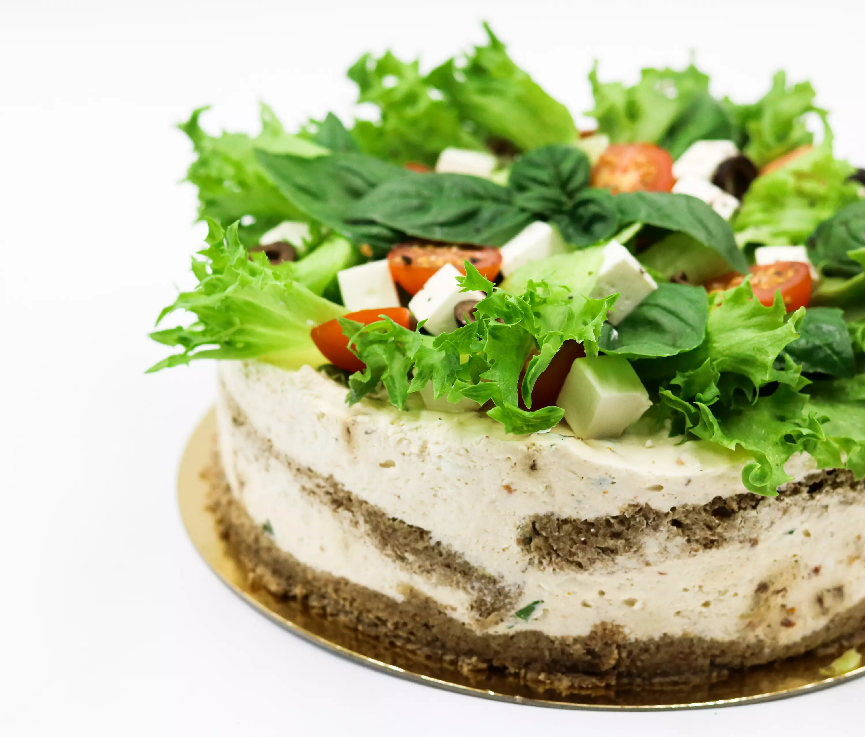 Laktoositon maustamaton TUOREJUUSTO [Pastöroitu rasvaton MAITO ja KERMA, suola, sitruskuitu, hapate], laktoositon vispiKERMA [Kerma, laktaasientsyymi, stabilointiaine (karrageeni)], laktoositon fetaJUUSTO [pastöroitu lehmänmaito, suola, juoksete, hapate, säilöntäaine (E202)], tumma voileipäkakkuleipä [VEHNÄjauho, vesi, RUISkuitu, RUISmallas, sokeri, hiiva, rypsiöljy, jodioitu suola (1,1 %), emulgointiaine (E482, E471), sakeuttamisaine (E412), happamuudensäätöaine (E262)], kasvisliemi [Kasvikset 43% (porkkana, palsternakka, sipuli, purjo), suola, kasvirasva(palmu), hiivauute, glukoosisiirappi, aromit (mm. persilja), kurkuma, riisijauho, maltodekstriini], kurkku, aurinkokuivattu tomaatti, basilika, oliivi, liivate (siasta), mustapippuri, suola salaattivalikoima, tomaatti, basilika, oliivi - VOIMAKASSUOLAINEN -