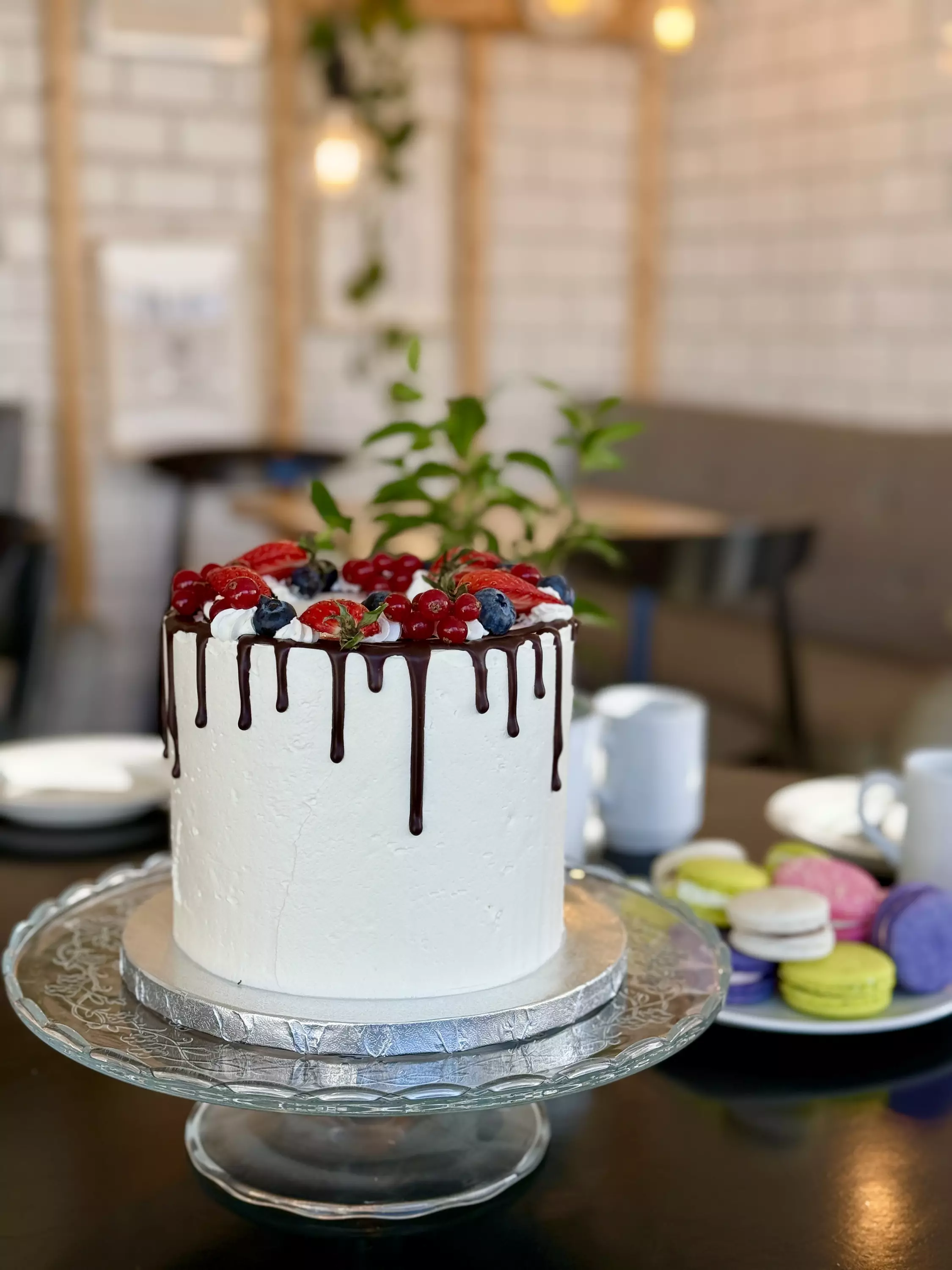 Juhlakauden marjaisa uutuus! Marja-suklaakakussa yhdistyy marjojen raikkaus ja suklaan täyteläisyys upeassa ulkomuodossa. Drop-reunus ja tuoreet marjat koristeena tekevät tästä kakusta juhlapöydän katseenvangitsijan!