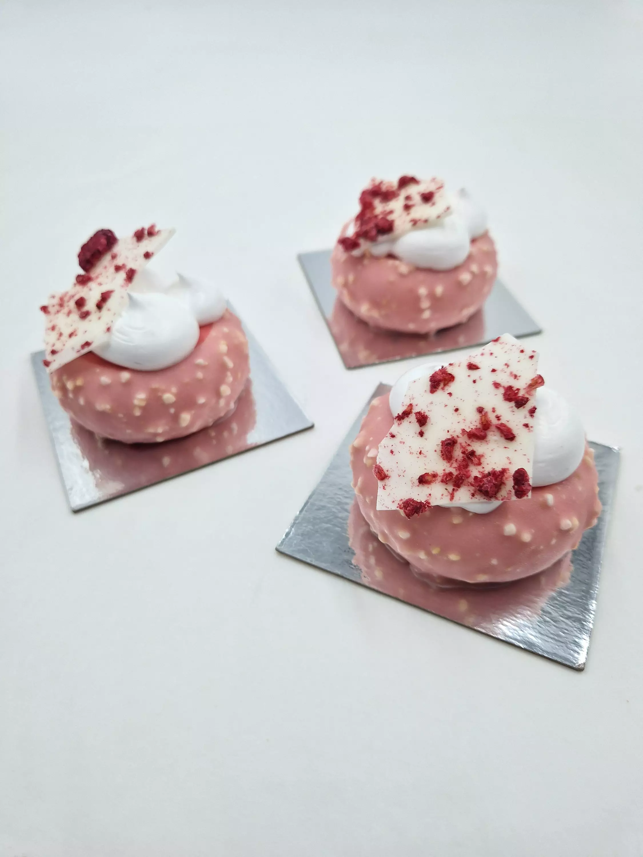 riscroissant (rårörsocker, puffat ris, karamelliserad sockersirap), frystorkat hallon, vanillin, färg (äpple och svarta vinbär)