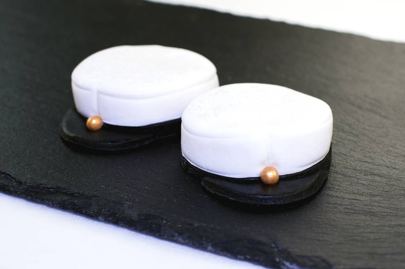 Käsintehty sokerimassainen lakkikoriste erikseen kakun päälle laitettavaksi. Koristeen halkaisija noin 5cm.